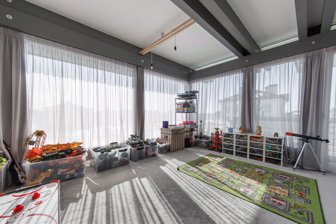 ПОЭТАЖНОЕ ОПИСАНИЕ: 1-ый уровень: гардеробная, кухня, столовая, гостиная, с/у, спальня с душевой кабиной, кабинет, постирочная, кладовка, бойлерная, летняя терраса 2-ой уровень: мастер-спальня с с/у и гардеробной, 2 детские спальни, с/у, игоровая комната 35 м2, 2 балкона