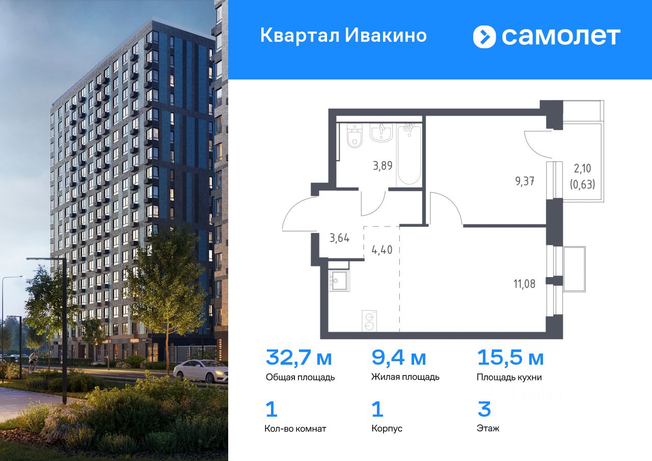 Предлагается 1-комнатная квартира комфорт-класса 32,7 кв.м в корпусе 1 на 3 этаже, в ЖК ''Квартал Ивакино'' Квартира с чистовой отделкой. Доступность дополнительных опций уточняйте у застройщика.