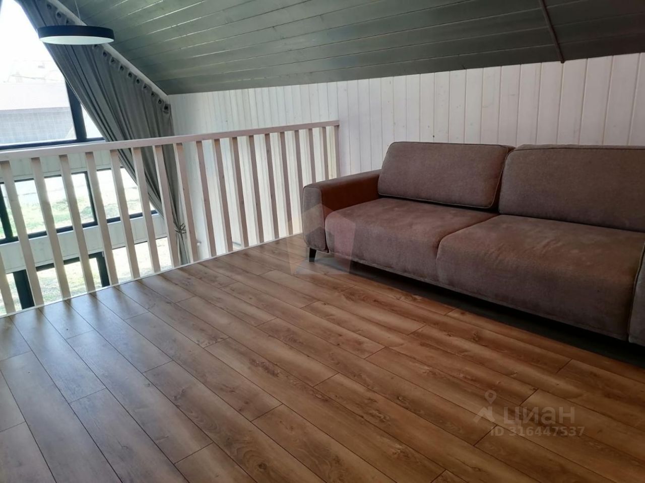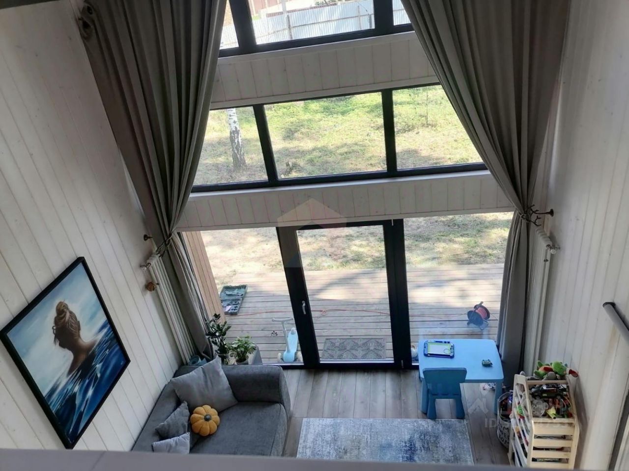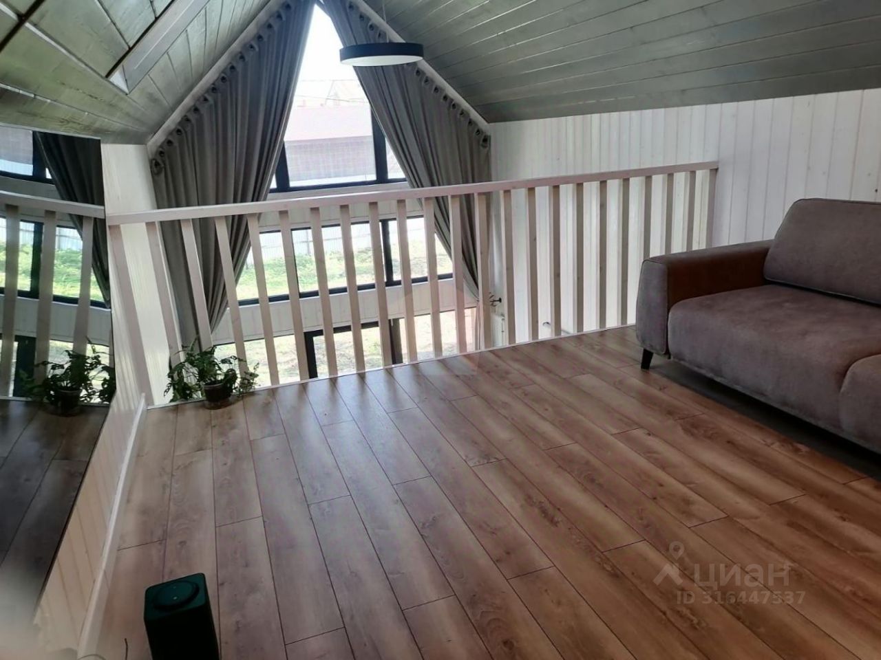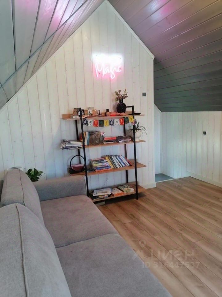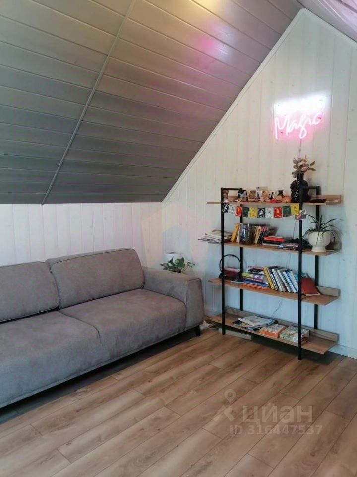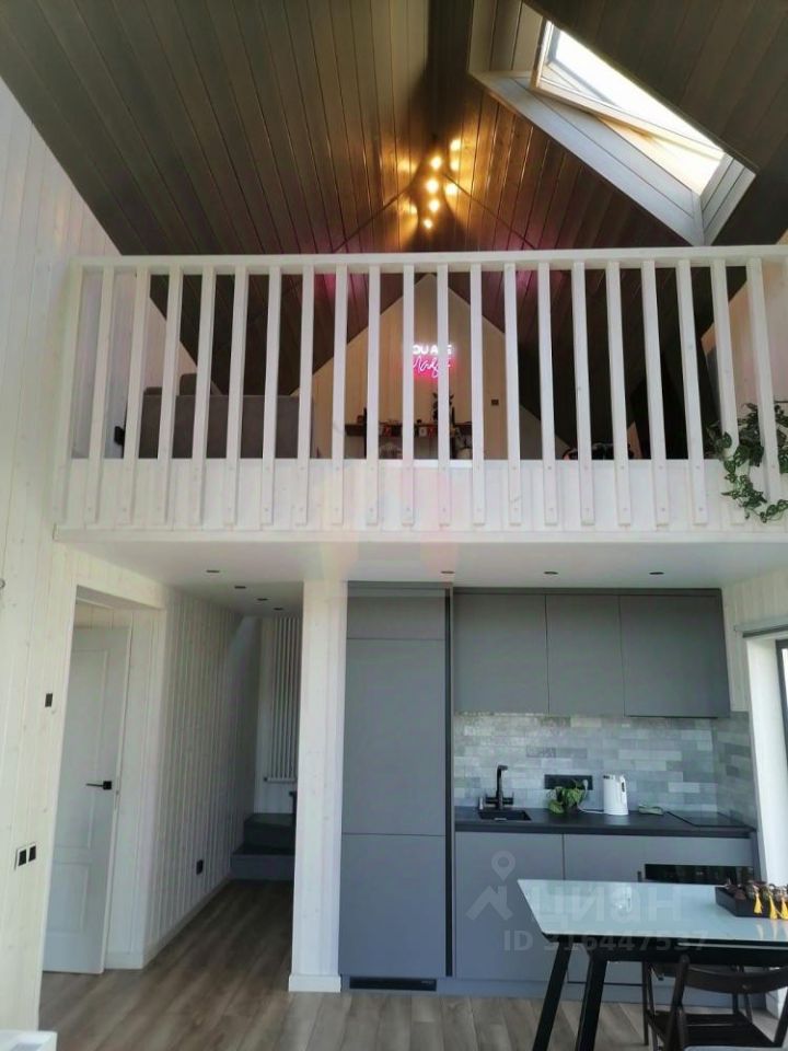 О доме: На первом этаже: Просторная кухня-гостиная (потолок 5,7м), два совмещенных санузла, спальная комната, гардеробная комната, терраса, На втором этаже: Небольшая спальная комната.