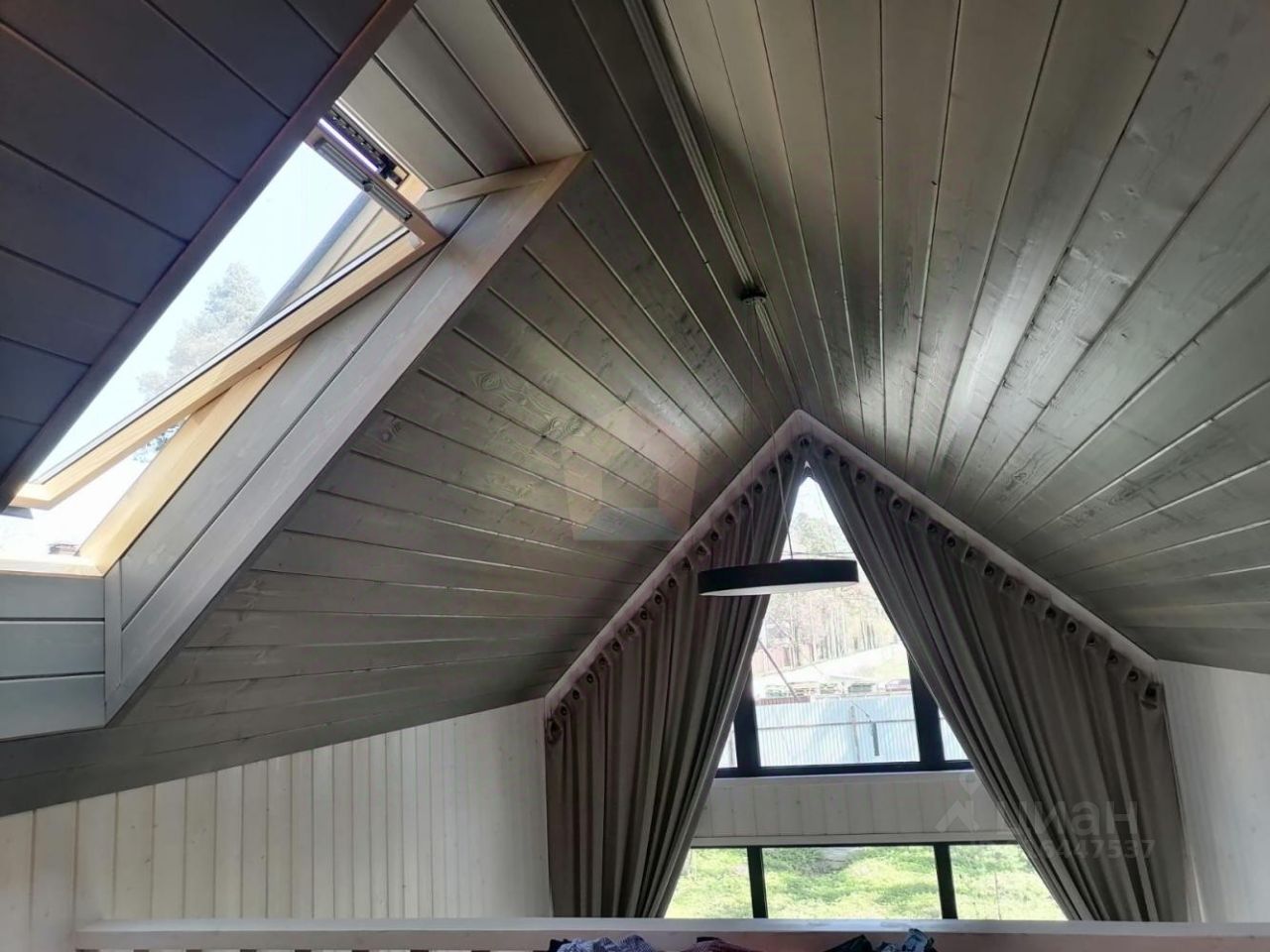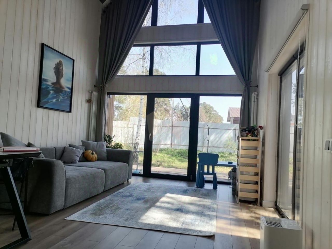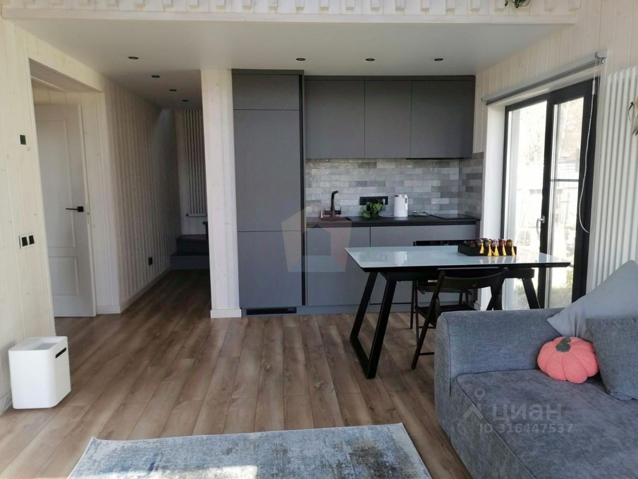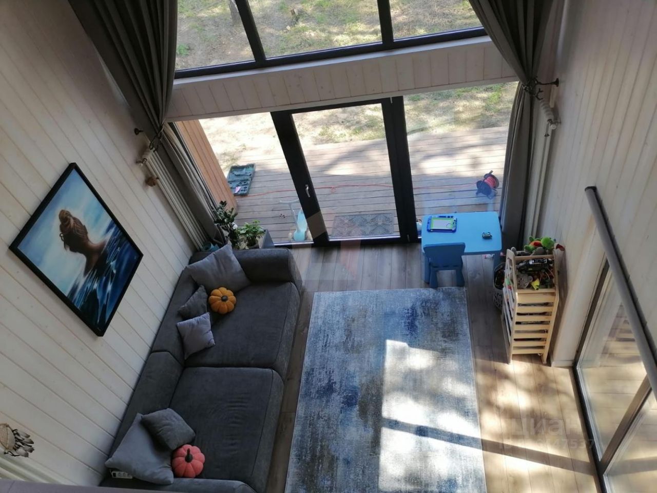 О доме: На первом этаже: Просторная кухня-гостиная (потолок 5,7м), два совмещенных санузла, спальная комната, гардеробная комната, терраса, На втором этаже: Небольшая спальная комната.