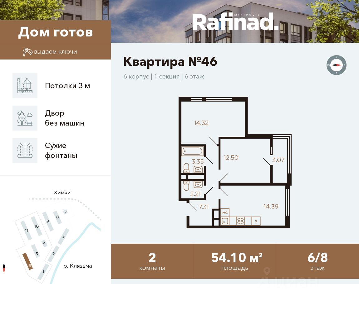 Продаётся 2-комнатная квартира общей площадью 54.10 м² на 6 этаже.
