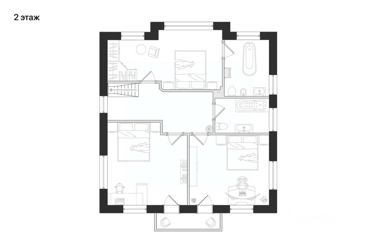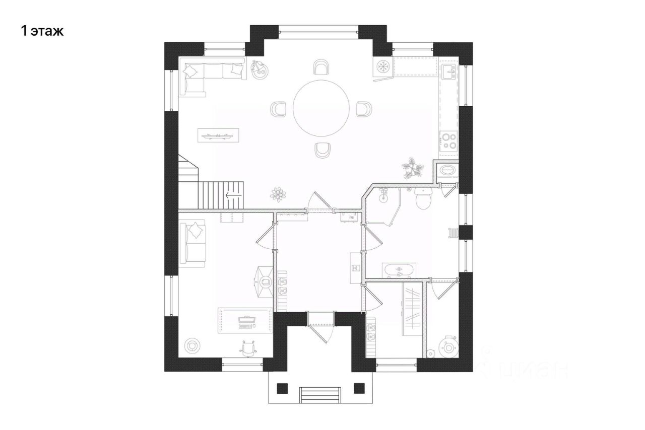 Планировка дома 6 1 этаж: прихожая, кухня-гостиная-столовая, санузел, кабинет/гостевая спальня, 2 этаж: мастер-спальня со своей ванной комнатой, две спальни, санузел.