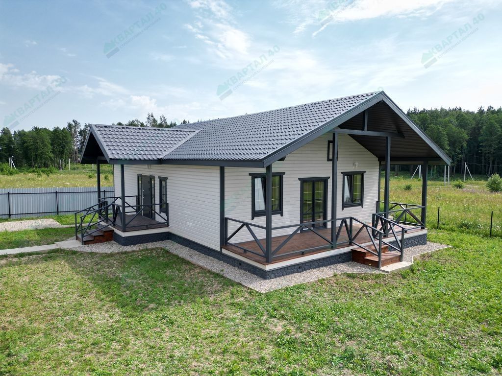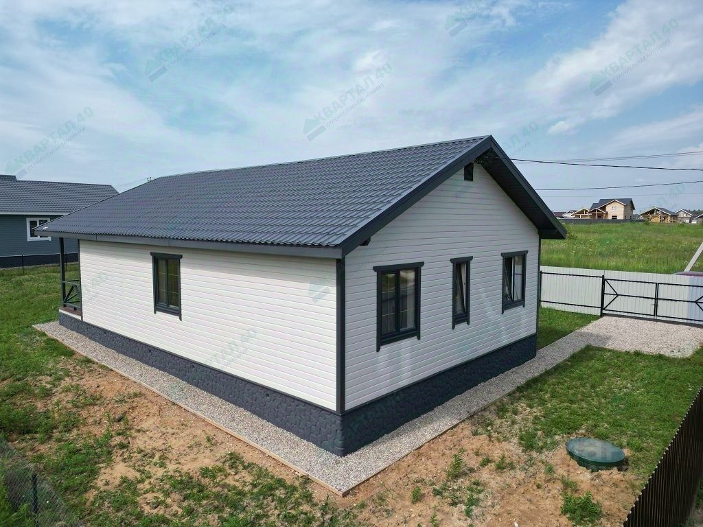 -Фундамент - ленточный, армированный, на песчаной подушке -Стены - брус 150х100 мм. утеплен мин.ватой 100 мм. -Отделка наружная и внутренняя - покрашенная имитация бруса -Полы - ламинат -Кровля- металлочерепица (установлены водостоки и снегозадержатели) -Окна - поворотно-откидные двухкамерные стеклопакеты