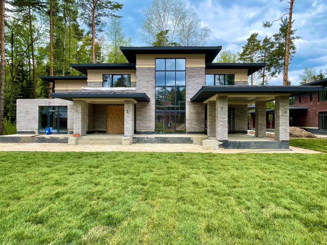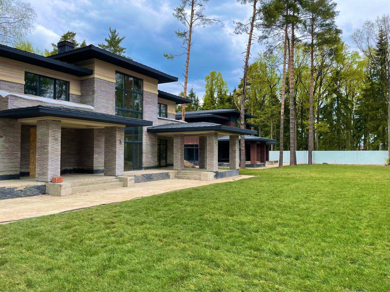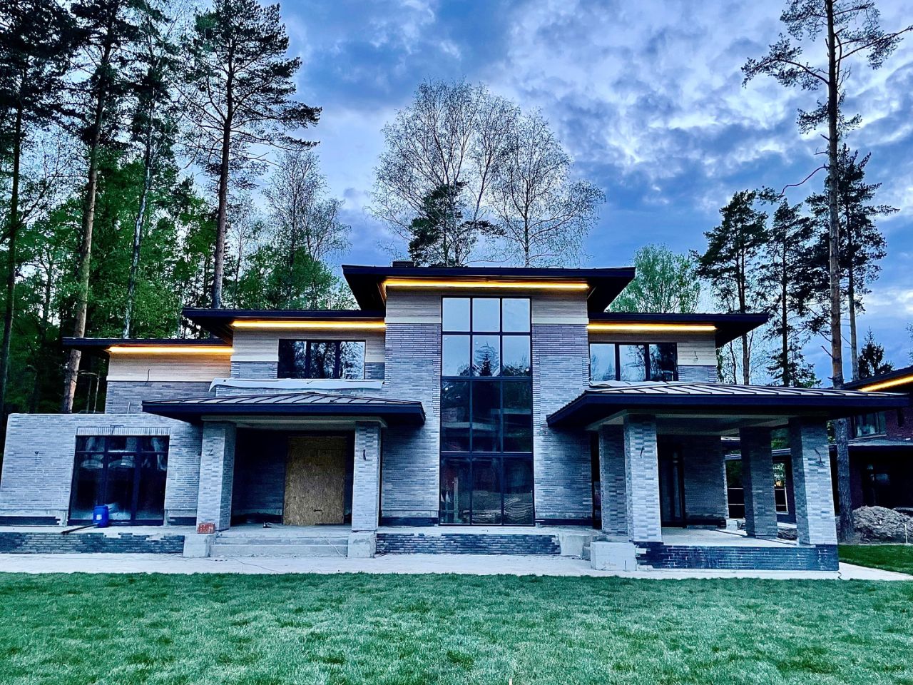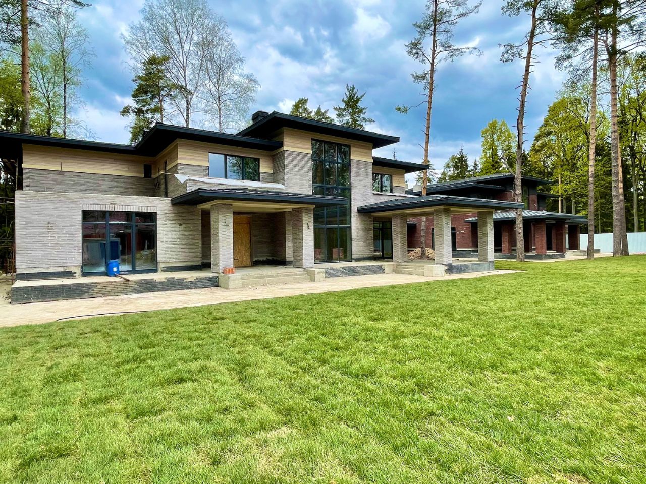 Новогорск дом в стиле Райт 460 кв.м (общая площадь с террасами 650 кв.м) на участке 20,59 сот, в современном стиле в охраняемом коттеджном поселке. Красивый лесной участок с соснами. Дом построен с применением материалов премиум класса, вторым светом (7 метров потолки) и панорамным остеклением. Все коммуникации центральные. Фундамент и перекрытия монолитные, стены Паротерм (керамические блоки), кровля кликфальц Гранд Лайн, свесы по 1,5 м, деревянные окна (Беларусь, сосна 1 сорт) и аллюминий на 2м свете. Фасад: клинкер/кирпич + термо-дерево лиственница второй этаж, подсветка фасада и кровли.