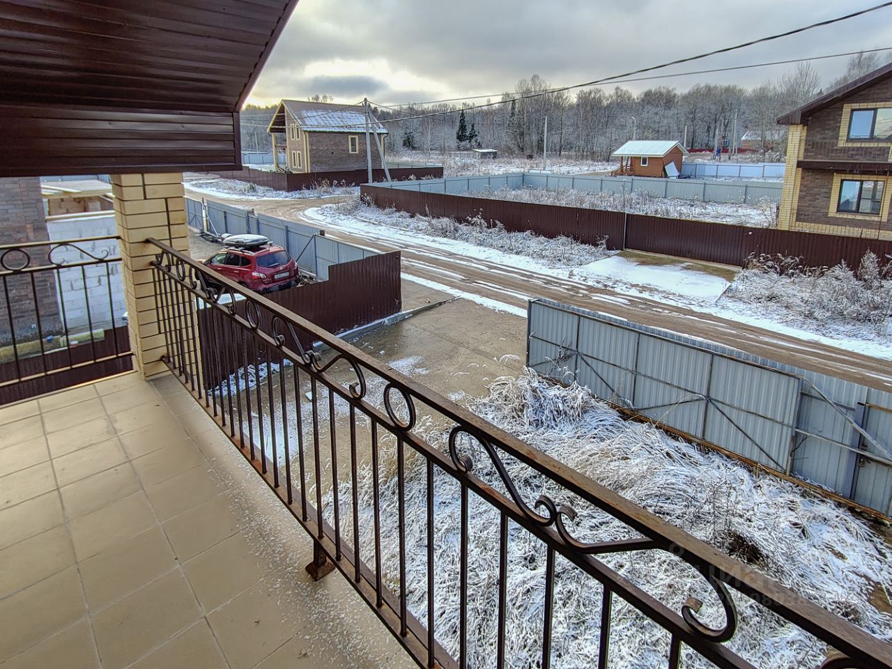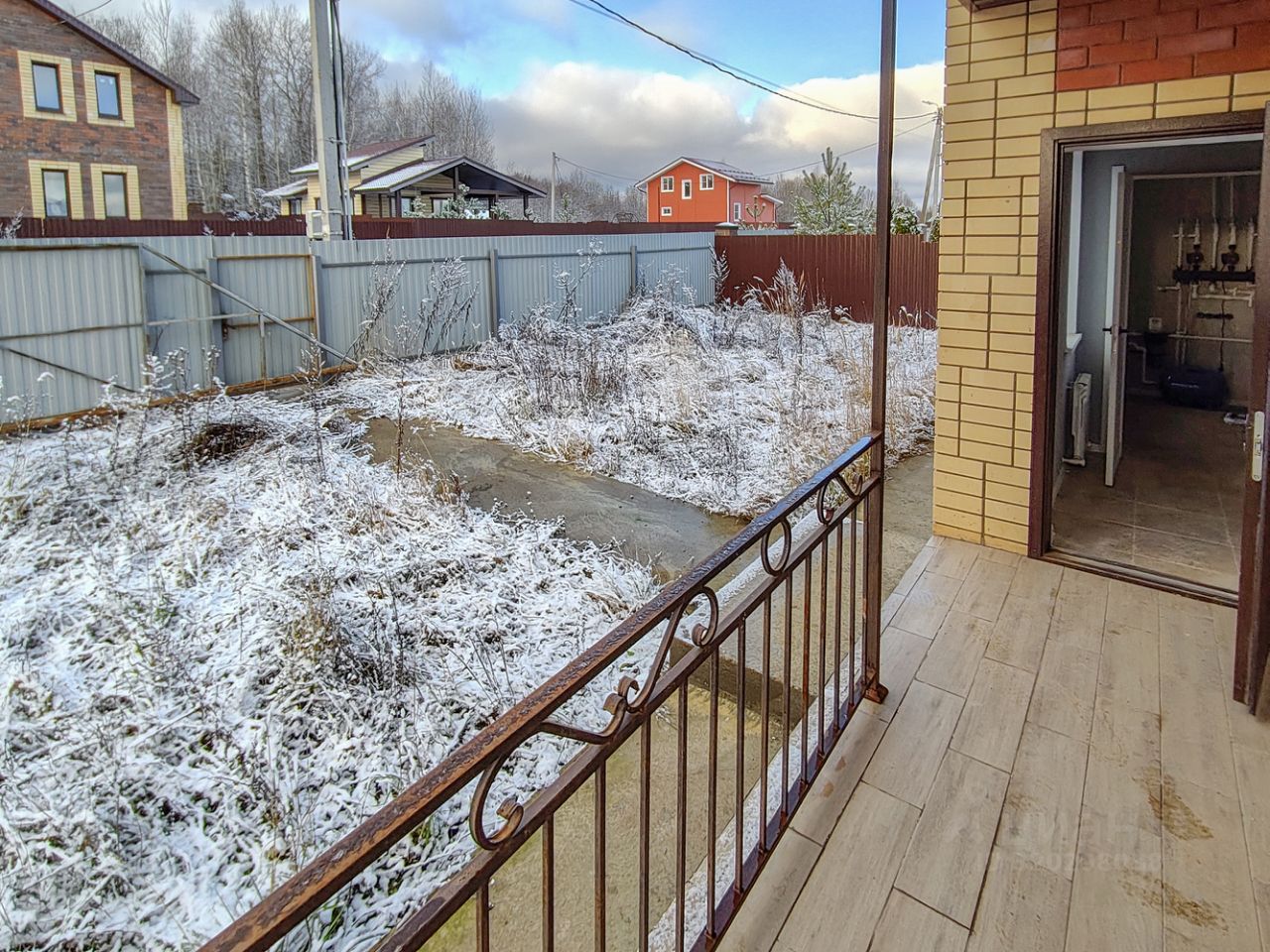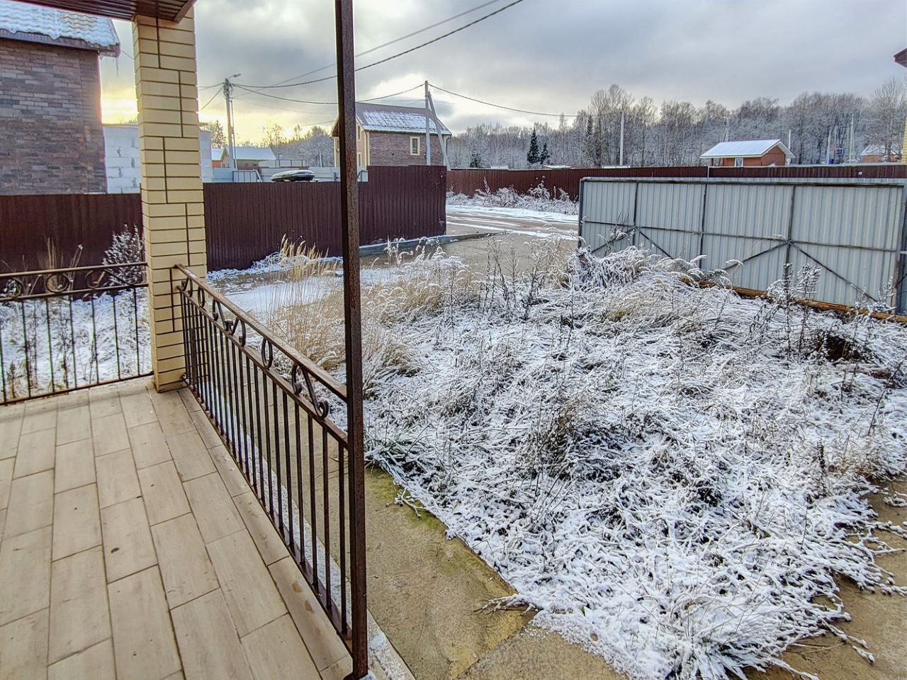 Участок полностью огорожен, откатные ворота и бетонная площадка для машины. Дом расположен ближе к переднему краю участка, оставлено много свободного места.