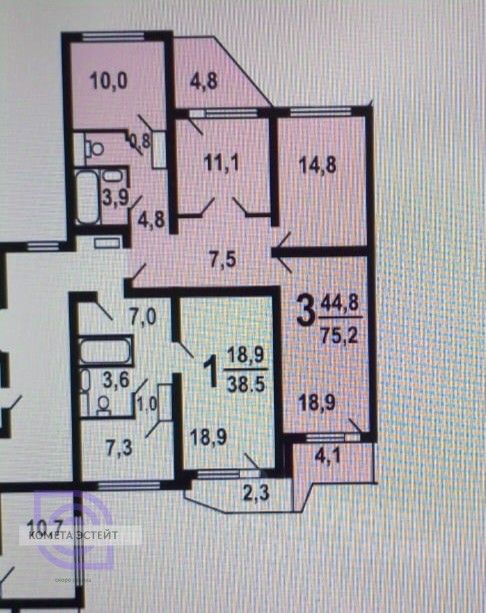 **Изолированная планировка** квартиры, с окнами на две стороны, создаст атмосферу уединения и спокойствия. Вы оцените просторные комнаты: 11 м², 14,8 м² и 18,9 м², каждая из которых обладает уникальным потенциалом для воплощения ваших идей по обустройству. Две уютные лоджии — 4,8 м² и 4,1 м² — отлично подойдут для того, чтобы насладиться утренним кофе или создать небольшой зеленый уголок.