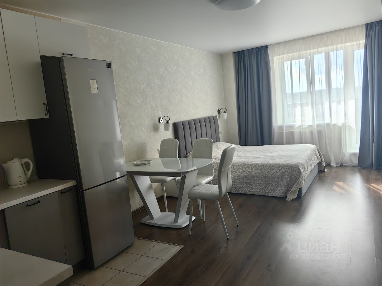 Студия полностью меблирована, много мест хранения. Кухня укомплектована всей необходимой техникой. Санузел совмещен. Из окон открывается вид во двор.