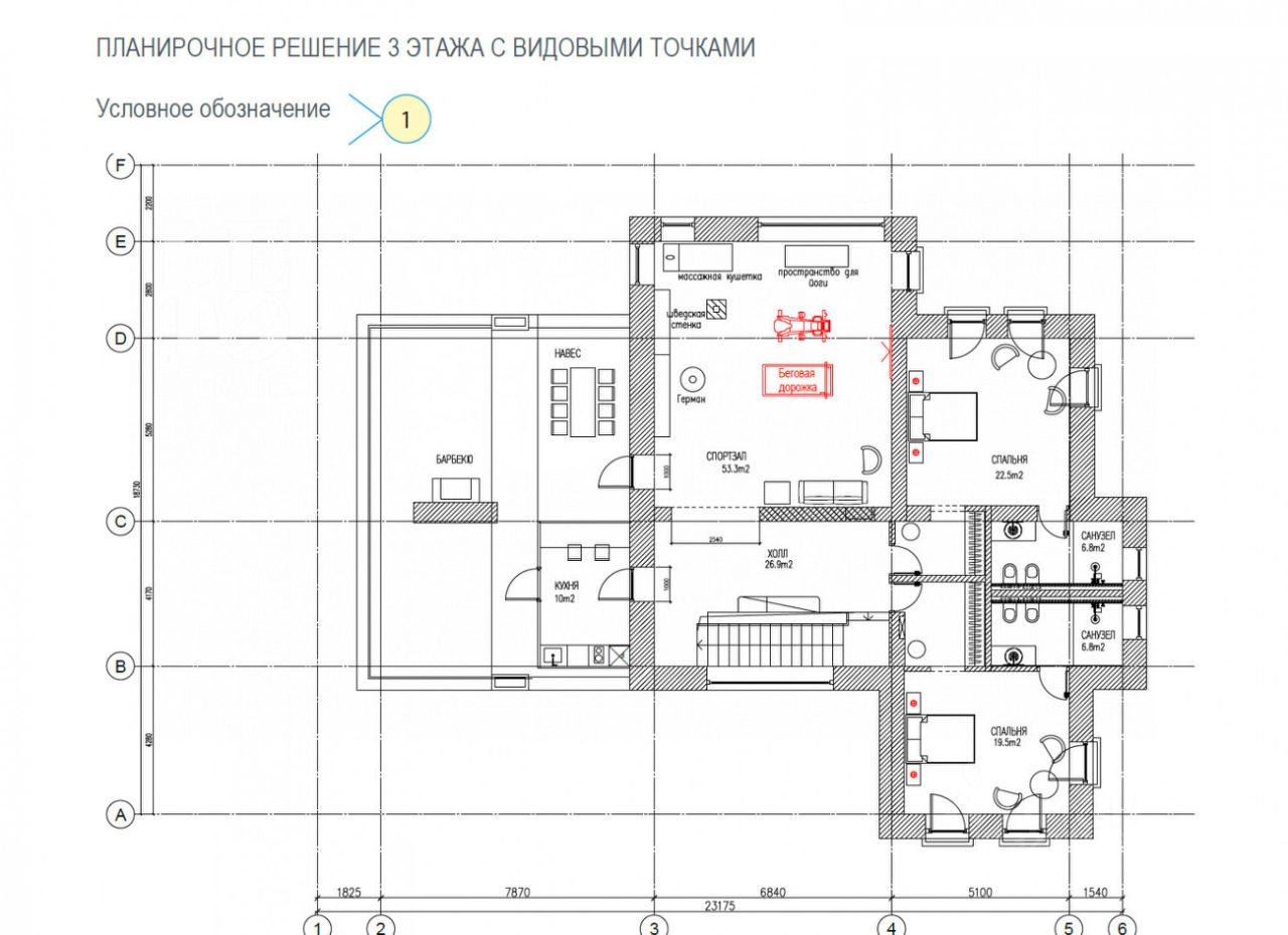 Планировка: Первый этаж: холл, гардероб, котельная, гостиная, кухня - столовая, бильярдная комната. Второй этаж: мастер спальня с гардеробом и санузлом, кабинет, вторая спальня с санузлом. Третий этаж: две спальни с отдельными санузлами и гардеробами, тренажерный зал, чайная зона с выходом на зону барбекю. Дом для помощника: кухня - столовая, две спальни, санзуел, котельная, гараж на две машины.