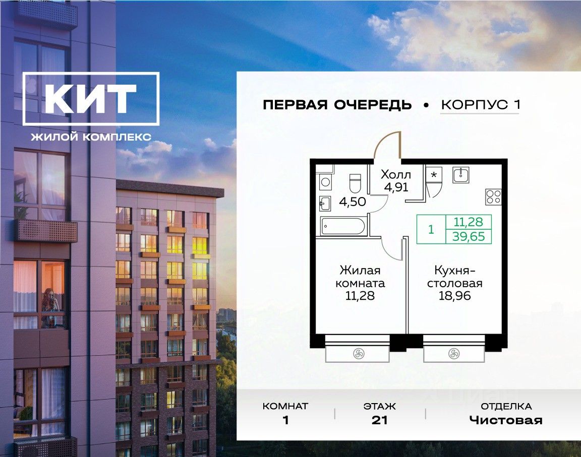 Продаётся 1-к квартира 39.7 кв.м. с чистовой отделкой в ЖК ''КИТ'' на 21-м этаже 25 этажного дома. Жилой комплекс ''Кит'' спроектирован в урбанистической концепции ''Город в Городе''. Объект бизнес-класса предлагает рациональный подход к набору опций, необходимых для гармоничной жизни. Проект представляет собой два корпуса, которые образуют единую приватную территорию. Ее доминантой является двор с красивым ландшафтным дизайном и различными зонами, ориентированными на интересы жителей разного возраста. При создании пространства в приоритет ставился комфорт жителей. В шаговой доступности находятся торговый центр, рестораны, кинотеатры, спортивный зал, образовательные учреждения и много других сфер услуг.