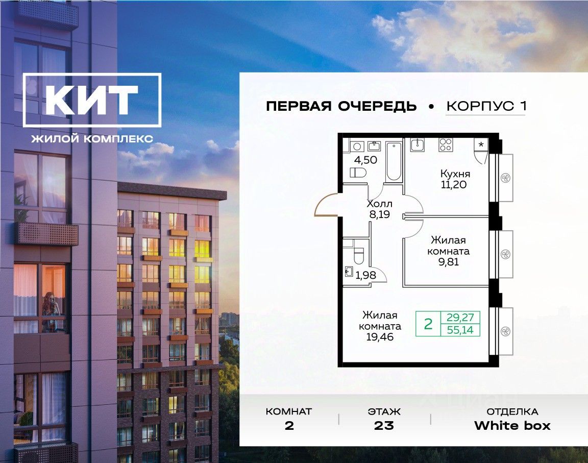 Продаётся 2-к квартира 55.2 кв.м. с чистовой отделкой в ЖК ''КИТ'' на 23-м этаже 25 этажного дома. Жилой комплекс ''Кит'' спроектирован в урбанистической концепции ''Город в Городе''. Объект бизнес-класса предлагает рациональный подход к набору опций, необходимых для гармоничной жизни. Проект представляет собой два корпуса, которые образуют единую приватную территорию. Ее доминантой является двор с красивым ландшафтным дизайном и различными зонами, ориентированными на интересы жителей разного возраста. При создании пространства в приоритет ставился комфорт жителей. В шаговой доступности находятся торговый центр, рестораны, кинотеатры, спортивный зал, образовательные учреждения и много других сфер услуг.