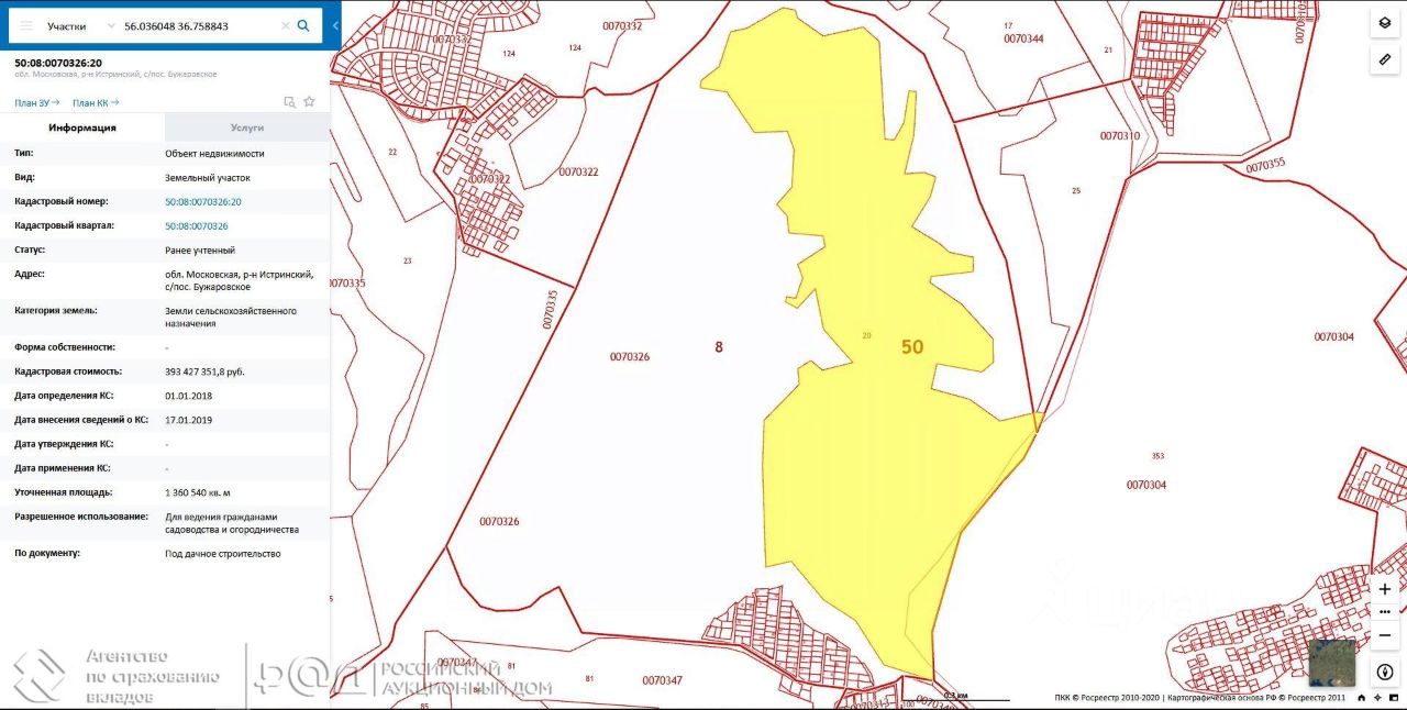 Имущество реализуется по поручению ГК ''Агентство по страхованию вкладов''. Код лота: РАД-259108. Реализуется на торгах. Выставляется на продажу земельный участок, площадью 1360540 кв м, расположенный по адресу: Московская обл. , Истринский р-он, с/пос, Бужаровский, уч. примерно в 400 м по направлению на юг от ориентира д. Якунино. Категория земель: земли с/х назначения для дачного строительства. География: деревня Якунино, находится в 14 км от гор. Истра, и в 56 км от МКАД, по Волоколамскому шоссе. Транспортная доступность Автобусная остановка ''Дачи'' находится в 2, 5 км от участка. Асфальтированная дорога. Инфраструктура: В 14 км расположен г. Истра, обладающий развитой инфраструктурой. Окружение: Коттеджные поселки, СНТ, лесной массив. Преимущества: Хорошее расположение для строительства коттеджного поселка. Участок находится в экологически чистом районе, окружен лесопосадками. Отличная транспортная доступность. https://catalog. lot-online. ru/index. php?dispatch=products. view&product_id=358970