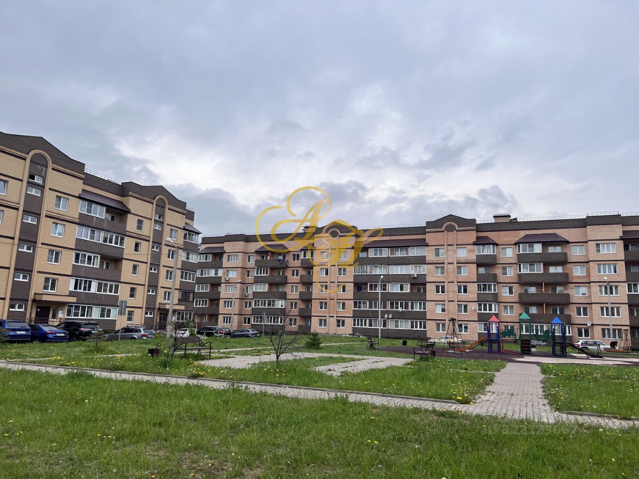 Во дворе просторная парковка для автомобилей, современная новая детская площадка