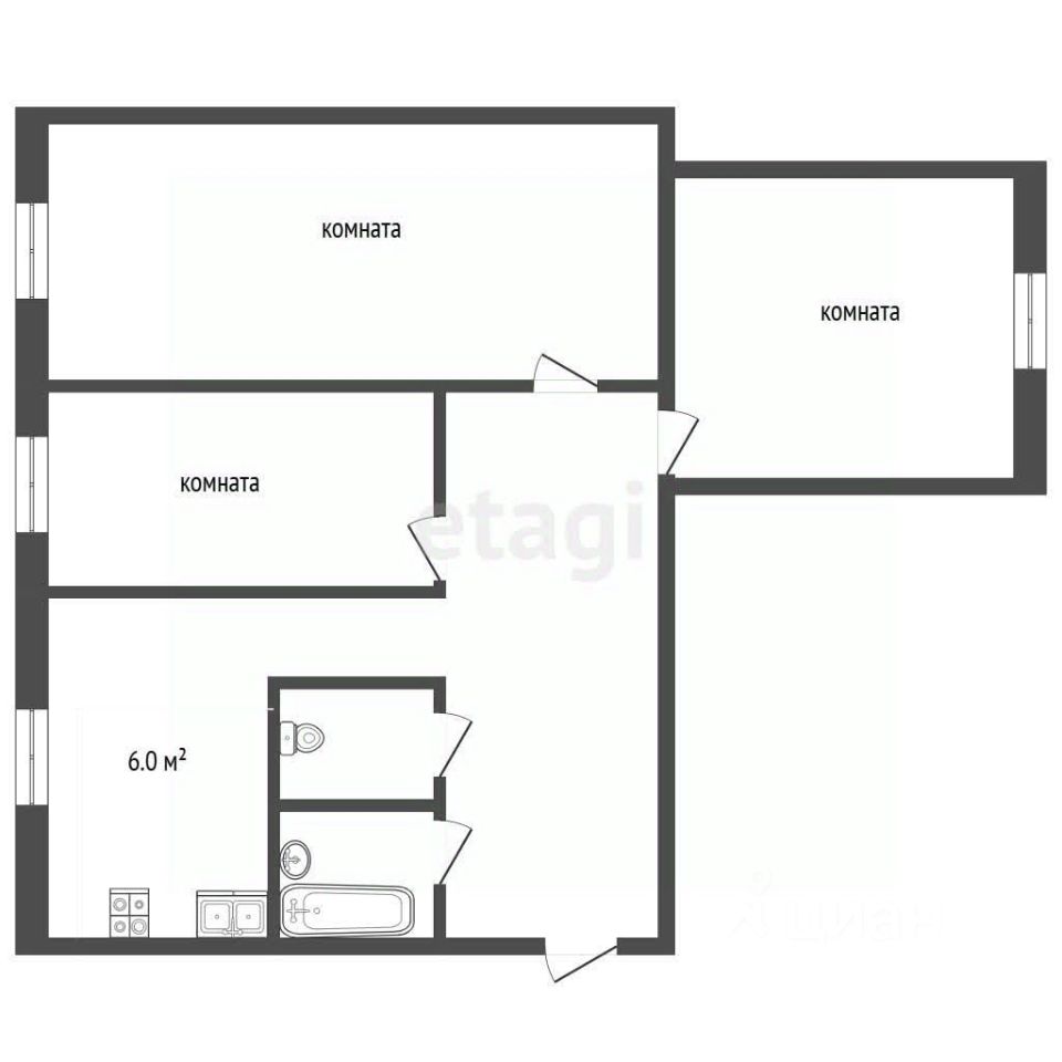 -Общая площадь 60 кв.м. -Кухня 6 кв.м. -Санузел разделен -Все три комнаты изолированы -Имеется застекленный балкон и лоджия