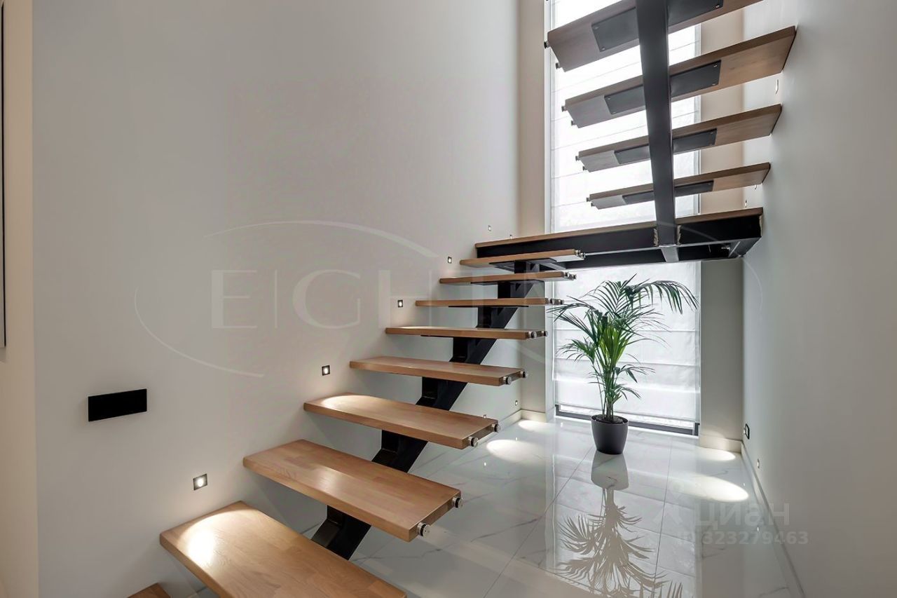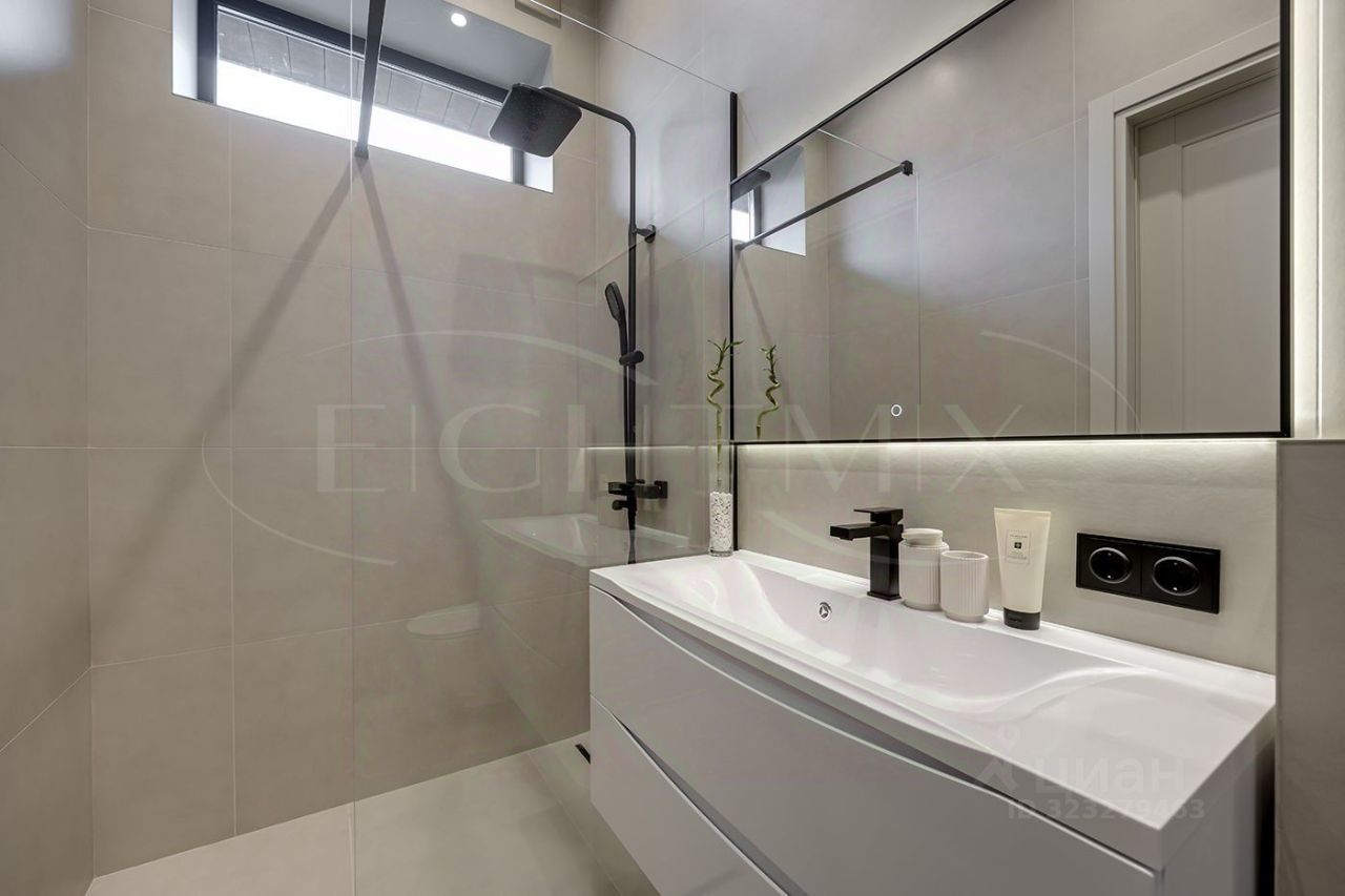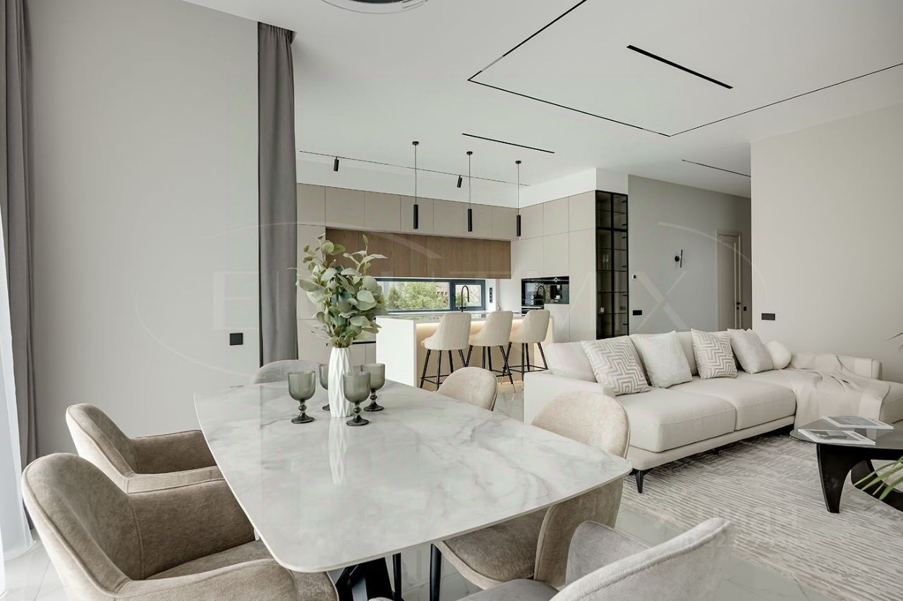 Внутренняя отделка выполнена из премиальных материалов, а интерьер дополнен стильной мебелью. В ванных комнатах установлена сантехника высокого класса. Панорамные окна, второй свет и высокие потолки 3.2 м