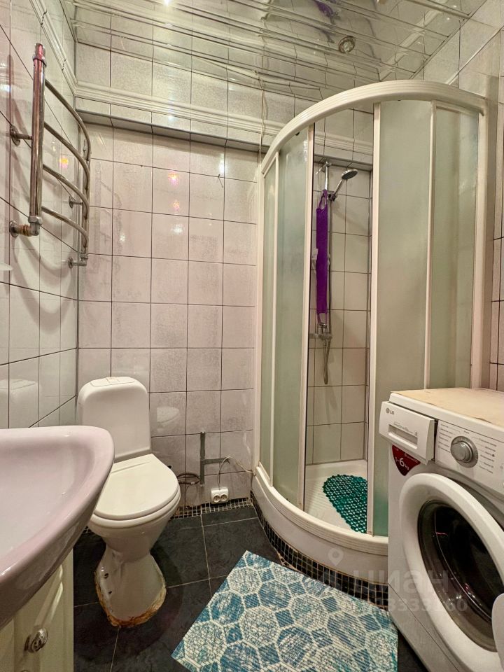 — Ванная комната достаточно просторная, так как установлена душевая кабина, есть место и для стиральной машины.