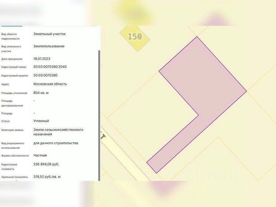 Земельный участок: кадастровый номер 50: 03: 0070380: 2040площадь 804 кв. мКатегория земель: Земли сельскохозяйственного назначенияВид разрешенного использования: Для дачного строительства