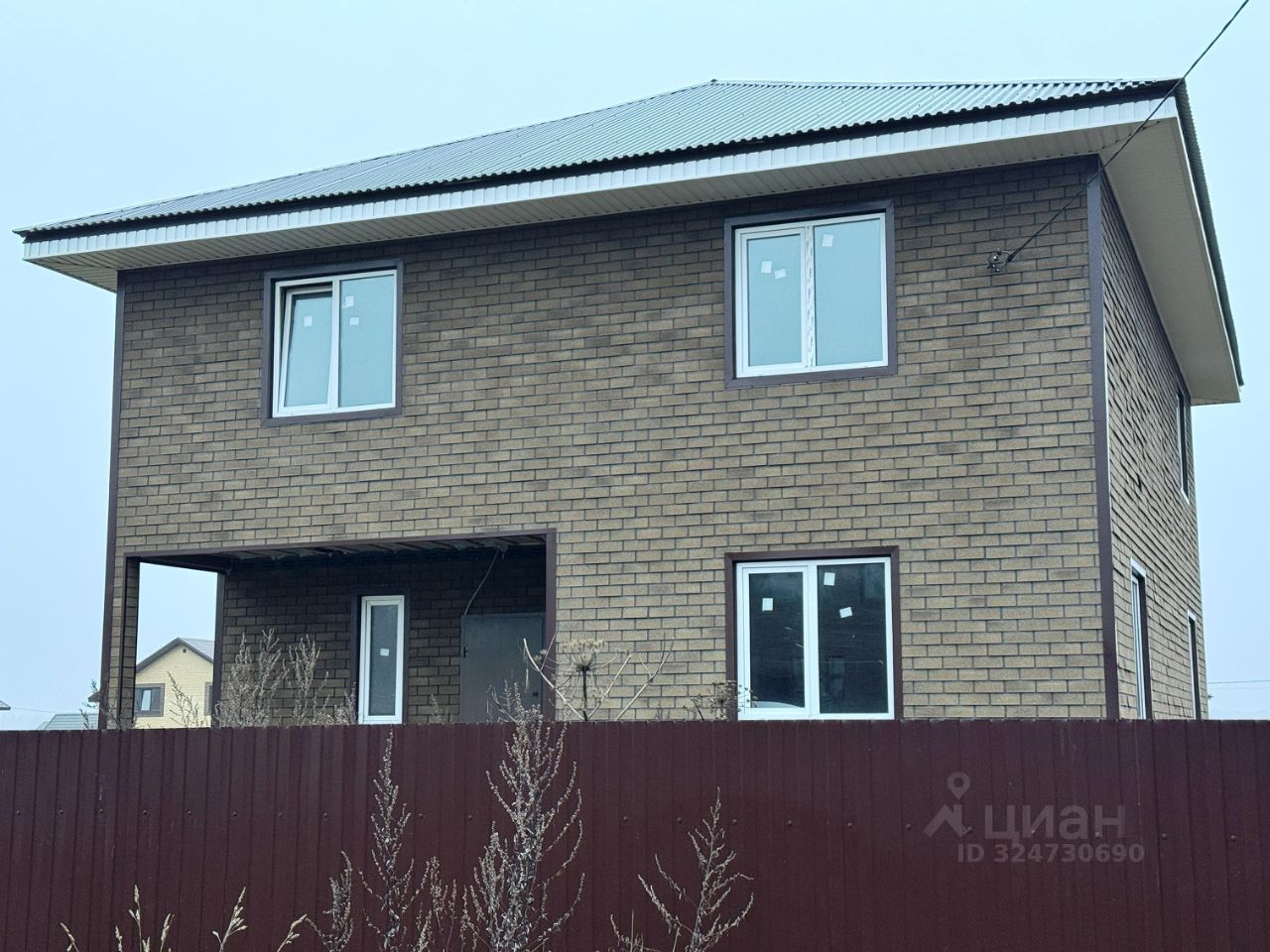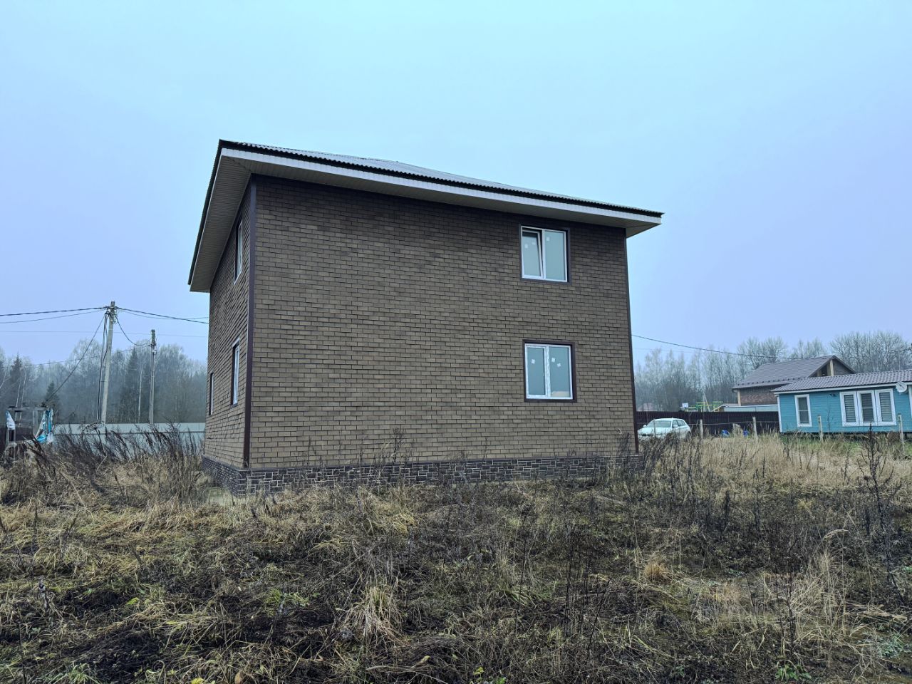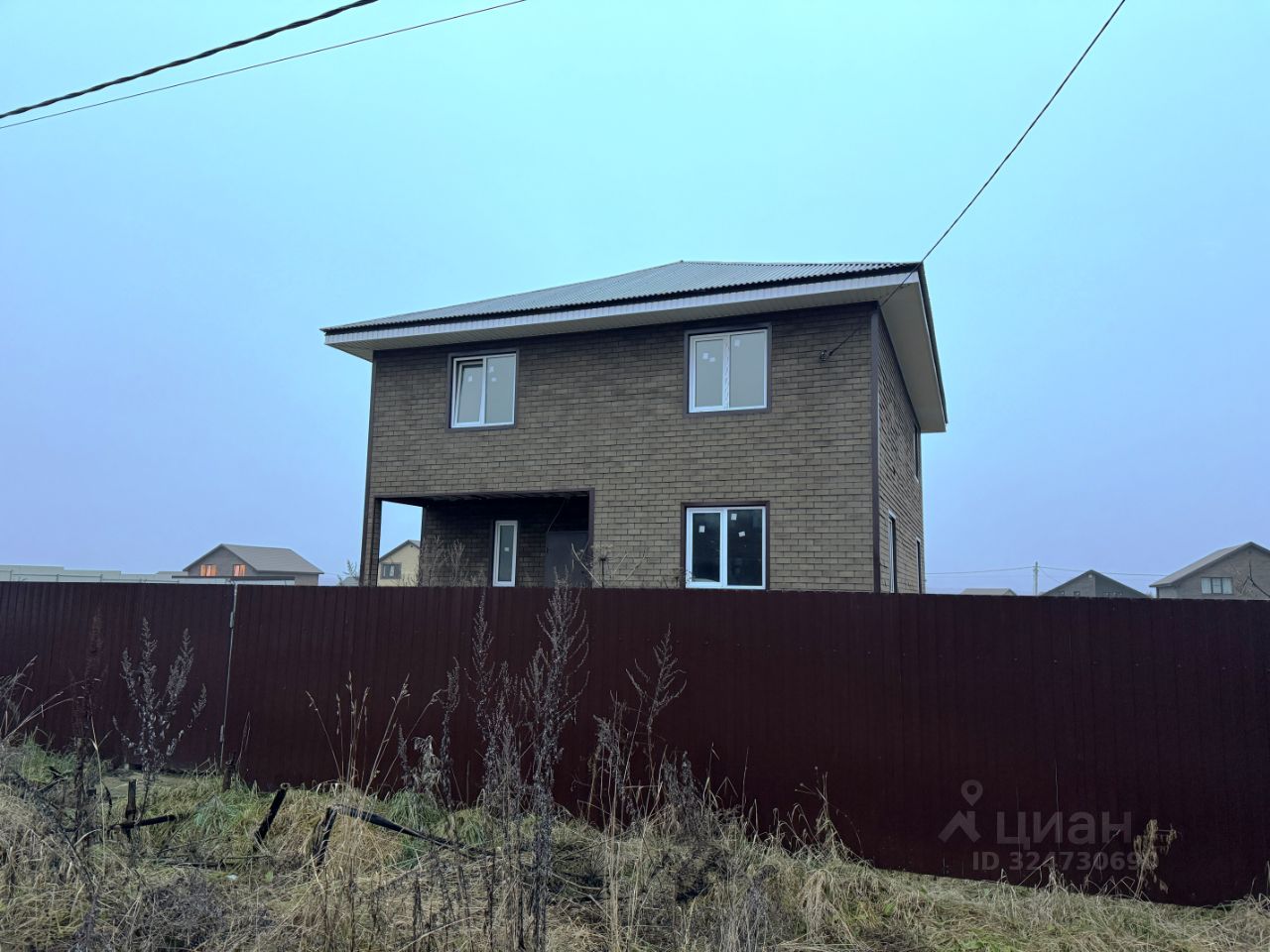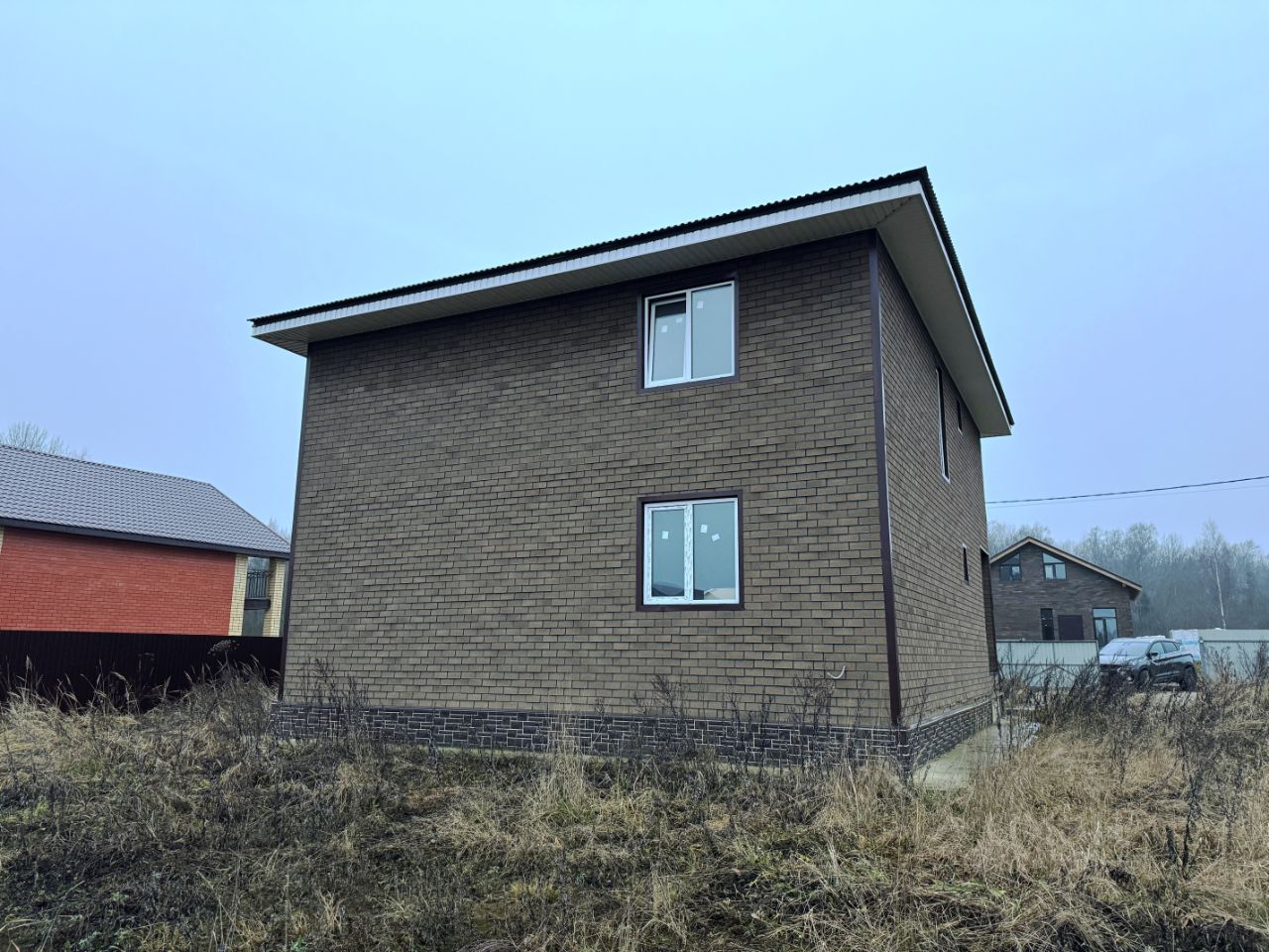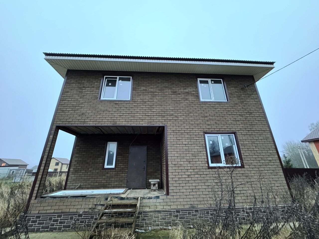 Каркасный дом в процессе отделки на капитальном ленточном фундаменте. Кровля - металлическая черепица.