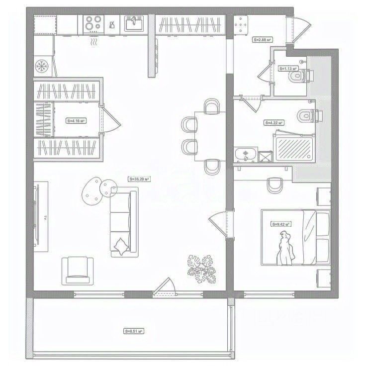Огромная гардеробная, большая кухня-гостиная со всей необходимой техникой, уютная спальня и два санузла.
