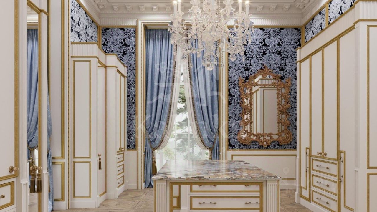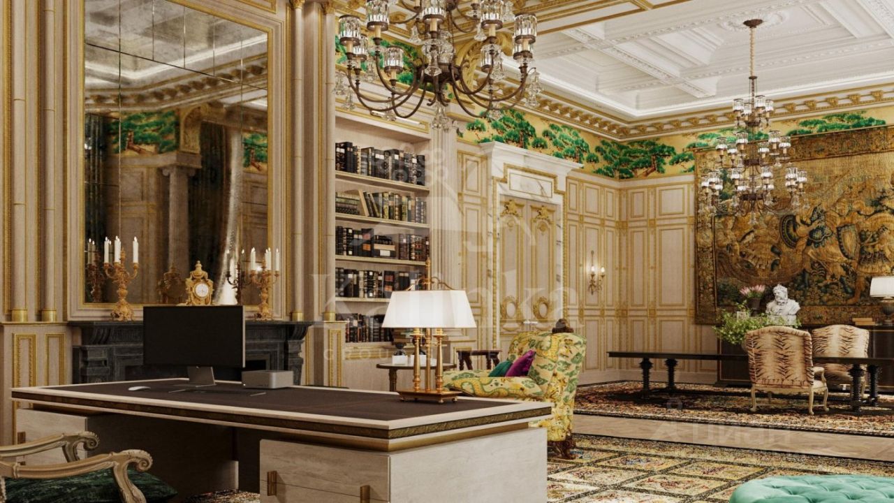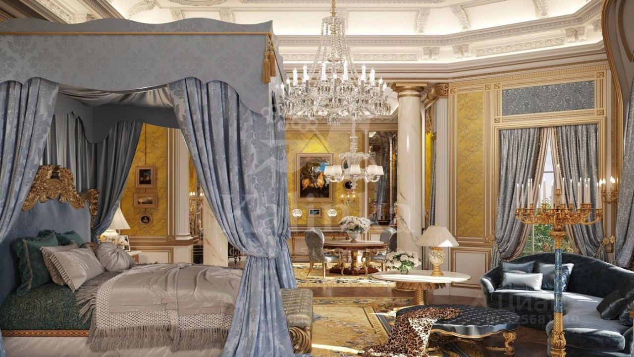 1 этаж: холл, каминная, гостиная, столовая, кухня, гардеробная, помещение для хранения сумок и чемоданов, шубная комната, санузел, сейфовая комната, кабинет, детская спальня с санузлом и гардеробной, две гостевые спальни с санузлами и гардеробными, санузел, блок для персонала с тремя спальнями и санузлами, детская игровая комната.