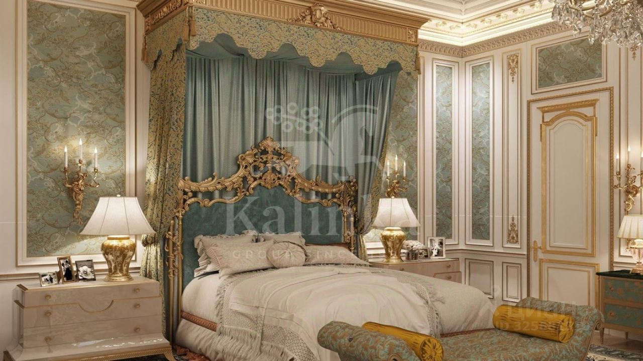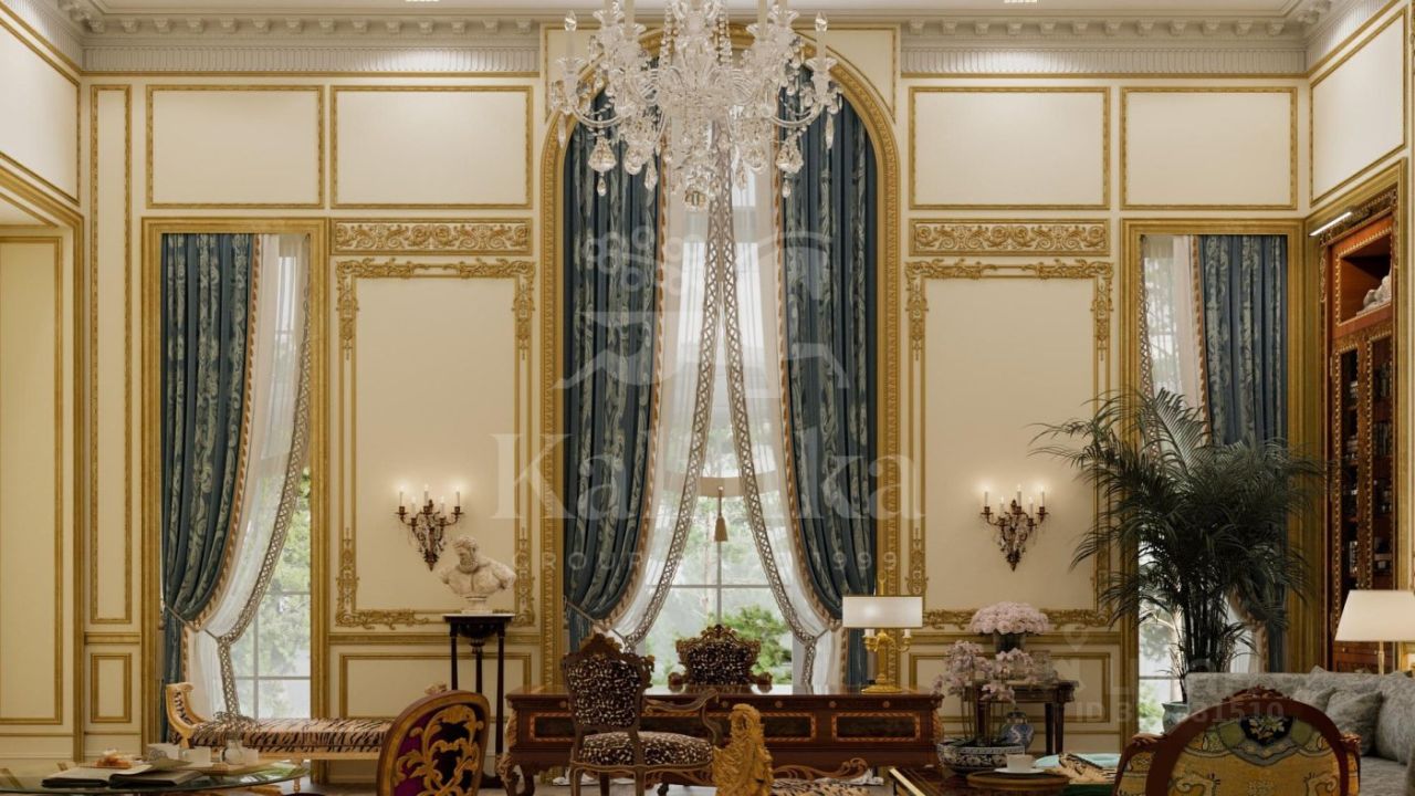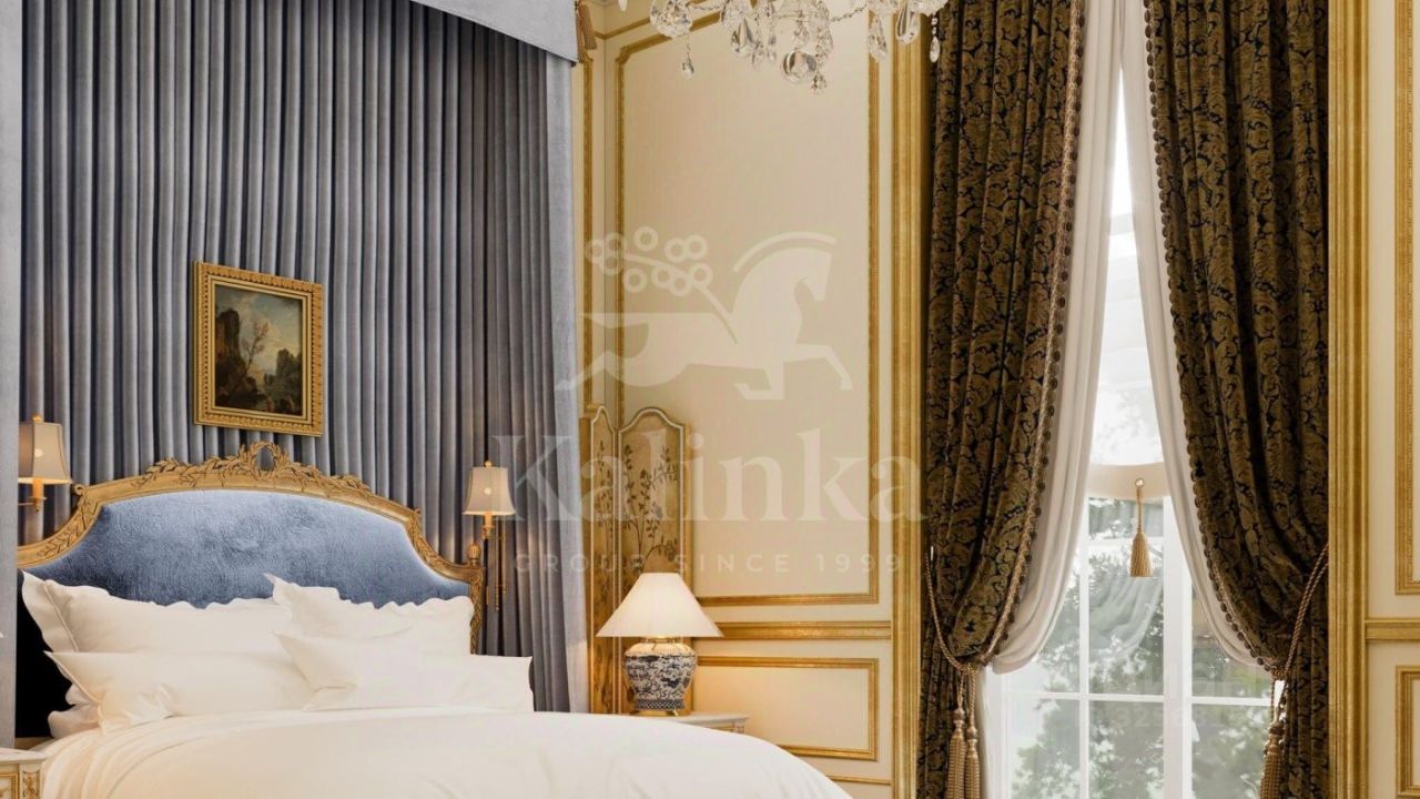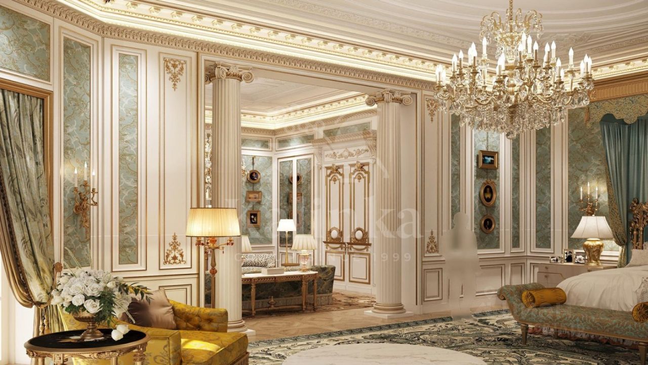 1 этаж: холл, каминная, гостиная, столовая, кухня, гардеробная, помещение для хранения сумок и чемоданов, шубная комната, санузел, сейфовая комната, кабинет, детская спальня с санузлом и гардеробной, две гостевые спальни с санузлами и гардеробными, санузел, блок для персонала с тремя спальнями и санузлами, детская игровая комната.