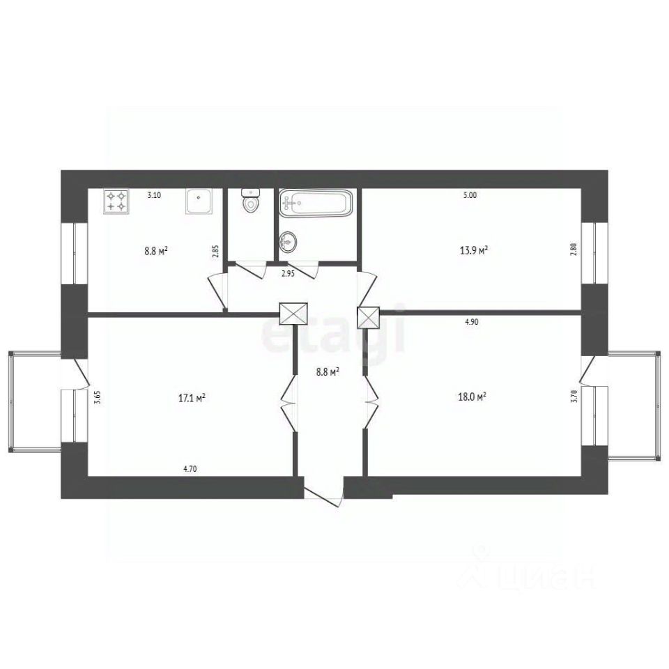 Квартира теплая и светлая, располагается на втором этаже трехэтажного кирпичного дома (дом после капитального ремонта). Три изолированные комнаты 17, 18 и 14 кв.м, раздельный санузел и кухня 9 кв.м, просторный коридор, два балкона.