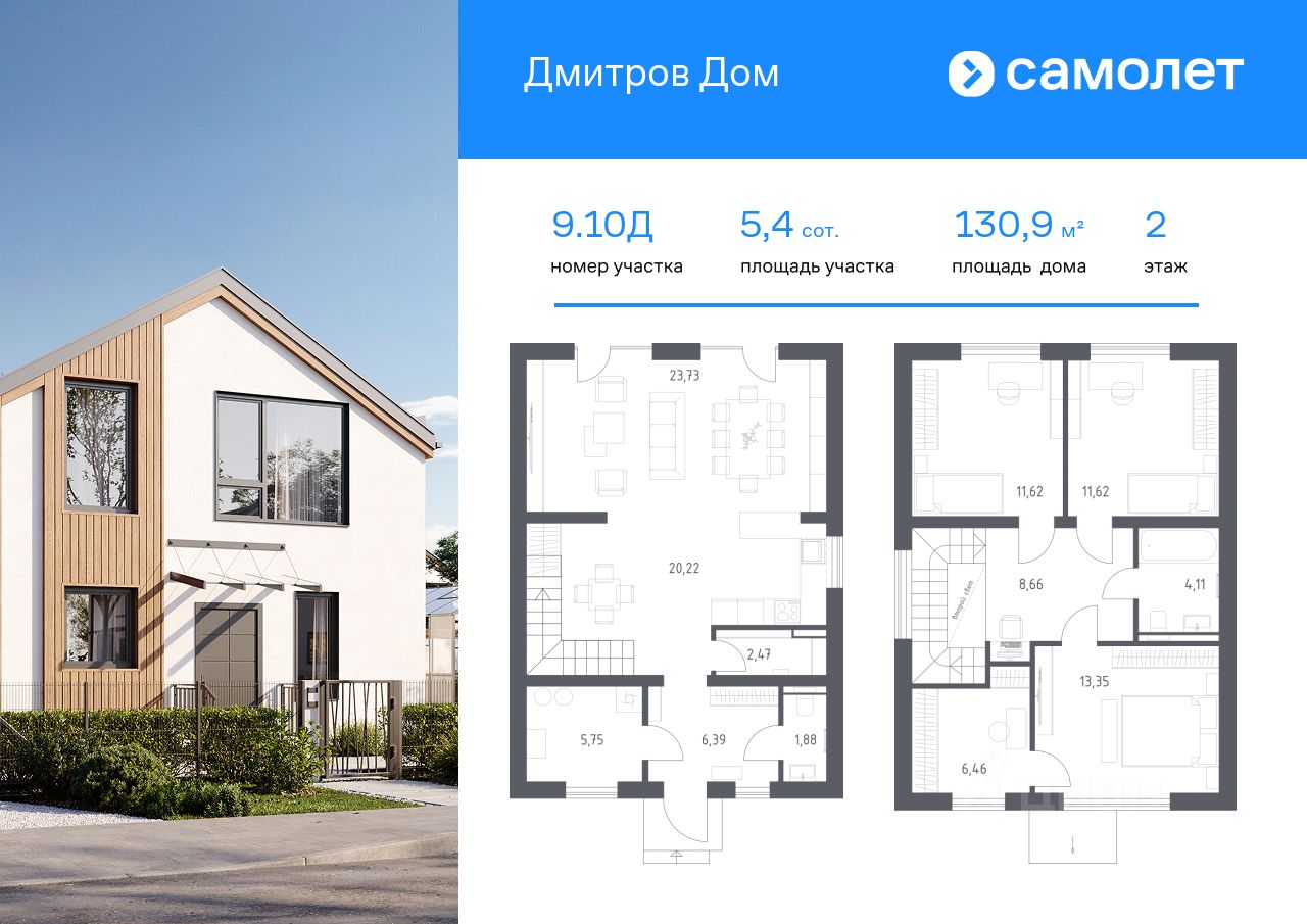 В продаже дом площадью 130,89 м2 на участке 5.4 от застройщика ''Самолет'' в загородном проекте ''Дмитров Дом''. Функциональная планировка, большие окна и высокие потолки. Дом без отделки.