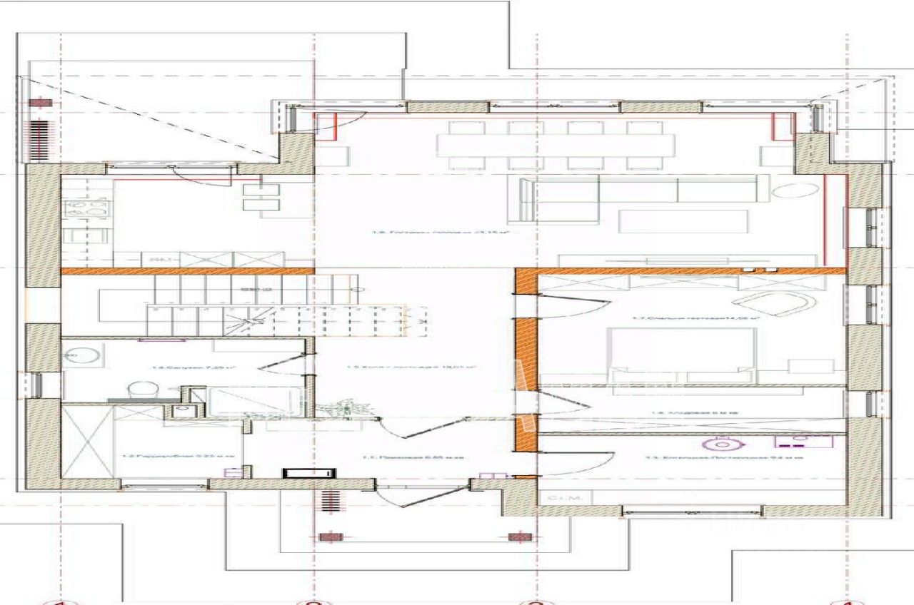 ЛОТ 58857 НР Продажа загородного дома площадью 250 кв.м. Новорижское шоссе, 23 км от МКАД, КП Новорижский. Дом построен в 2 этажа по авторскому проекту архитектурного бюро Артема Кузнецова, под строгим техническим надзором. Произведена геология грунтов — на основе него был сделан фундамент и конструктив всего дома (полная проектная документация). Фундамент и перекрытие — монолит. Фасад выполнен в дагестанском камне с элементами плитки ручной формовки TEGLA. Панорамные окна от компании REHAU серия - Intelio 80. Инженерная часть Stout оригинал , используется нержавеющие трубы в бойлерной, сливной трап, система протечки воды (с датчиками в мокрых зонах), мастер кнопка, электропривод штор, кондиционеры, современный дизайн проект от дизайнера с современными модными решениями.