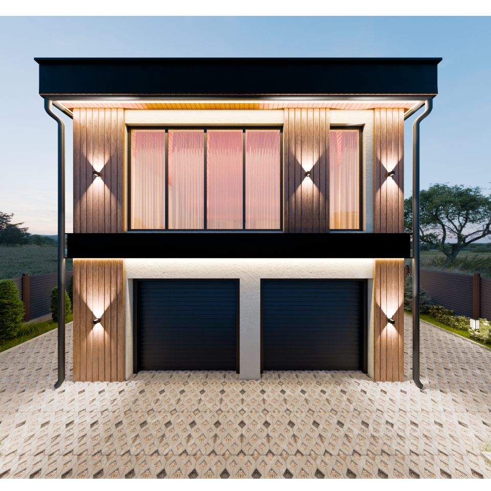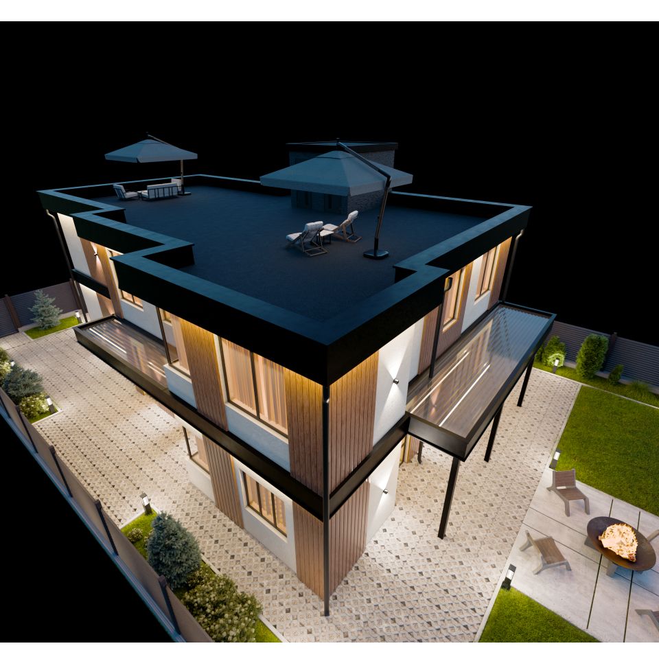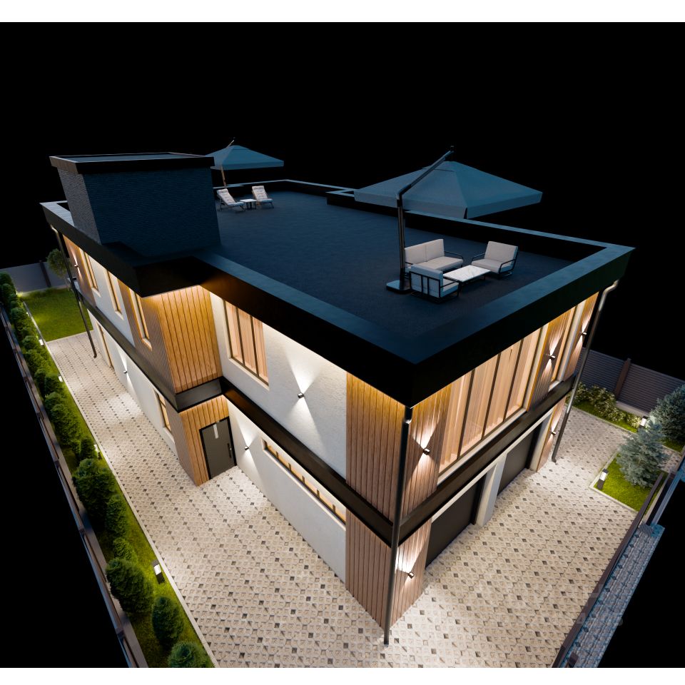 1 этаж. Просторная кухня-гостиная (52 м²) с потолками высотой 4 метра, панорамными окнами в пол и выходом на огромную террасу со стеклянным потолком — идеальное место для семейных вечеров и приёма гостей. Отдельное помещение для инженерного оборудования (котел, бойлер, фильтры и пр.), туалет, кладовая для хранения кухонной утвари и продуктов (можно использовать как бар). Просторный светлый гараж на два автомобиля с входом в дом.