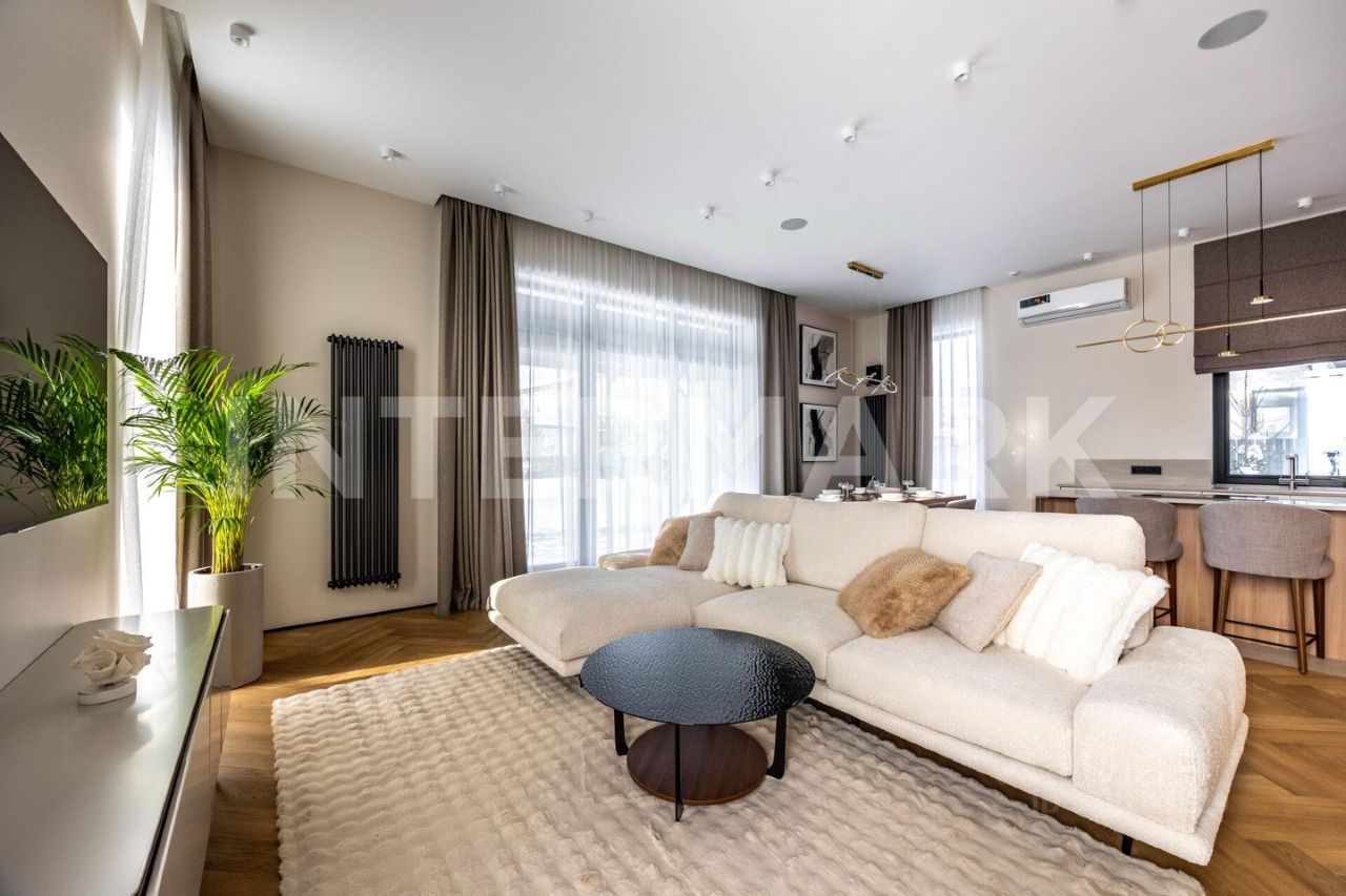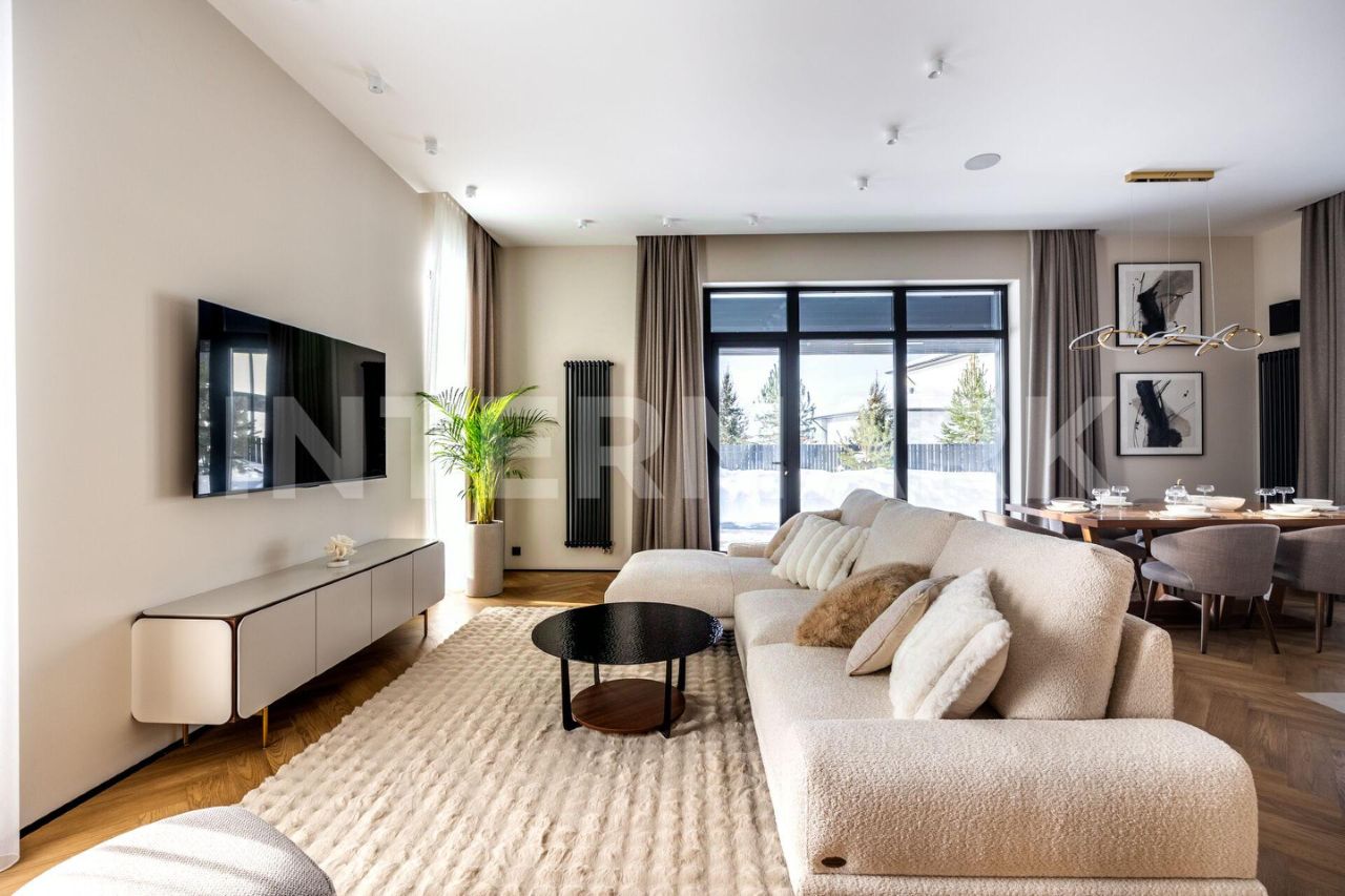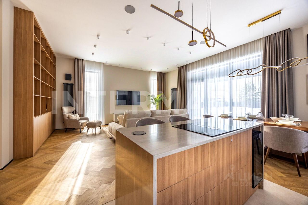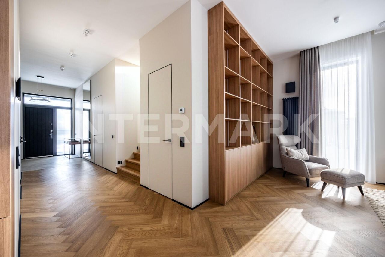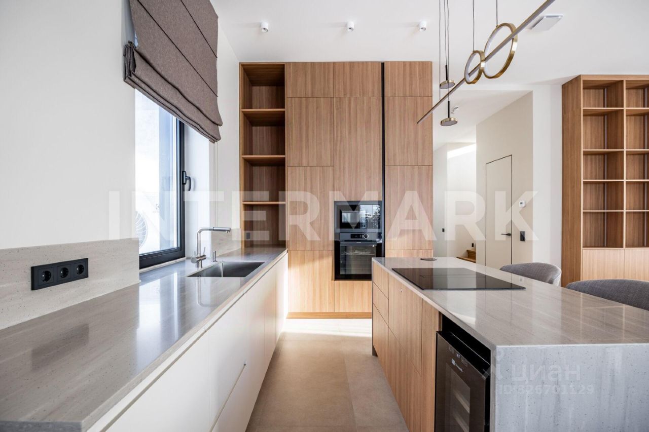 ID 8268. Павловы Озера. Дом площадью 307 кв. м — воплощение современной загородной эстетики, где каждый квадратный метр работает на ваш комфорт. Проект отличается впечатляющим объемом: высота потолков составляет 3,30 метра на первом этаже и 3,10 метра на втором. Центральное место занимает светлая кухня-гостиная с выходом на террасу. Интерьер укомплектован премиальной бытовой техникой брендов Asko и De Dietrich, включая элегантную вытяжку, интегрированную в варочную панель на кухонном острове.